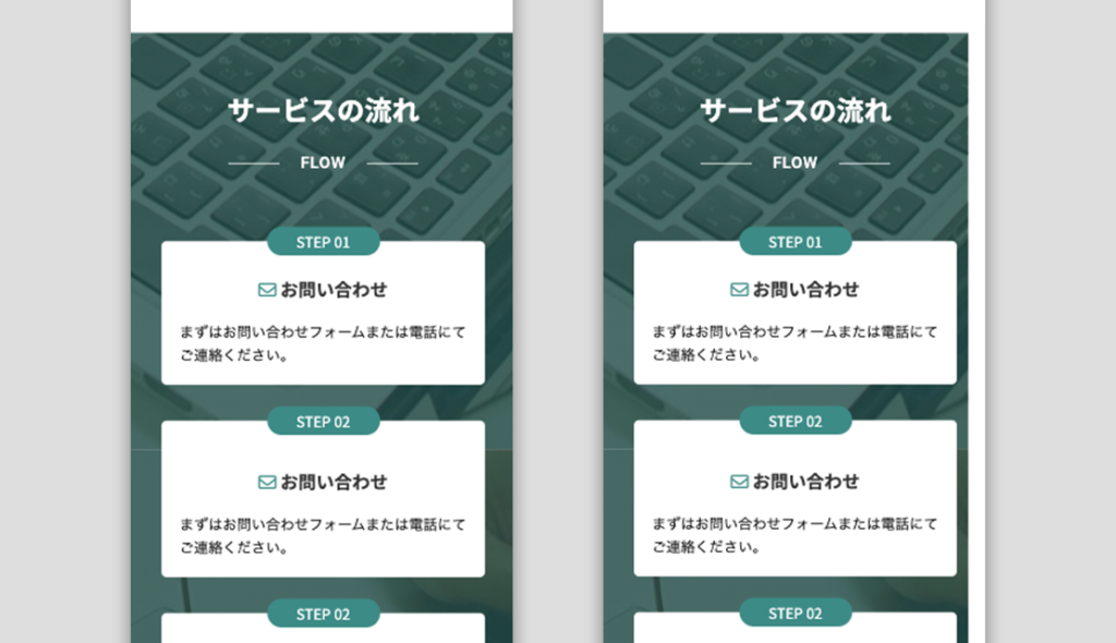 今回は「サービスの流れ カードカラム オフセット背景 余白右 5%」のパターンを配置して、スマホサイズ以下で余白を無くすクラス名を削除して、全サイズで余白がつくようにしていきます。