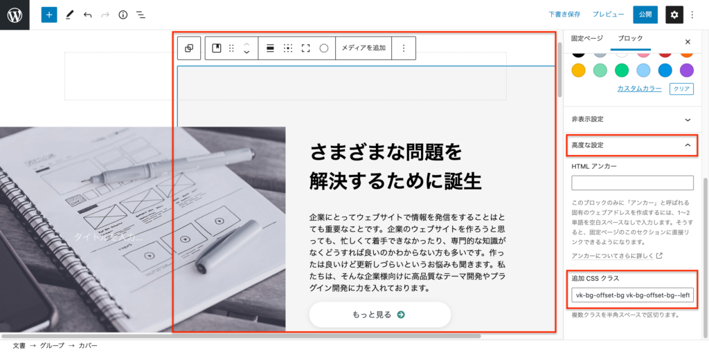 高度な設定の追加 CSS クラスから、vk-bg-offset-bg--no-offset-mobileのクラス名を削除します。